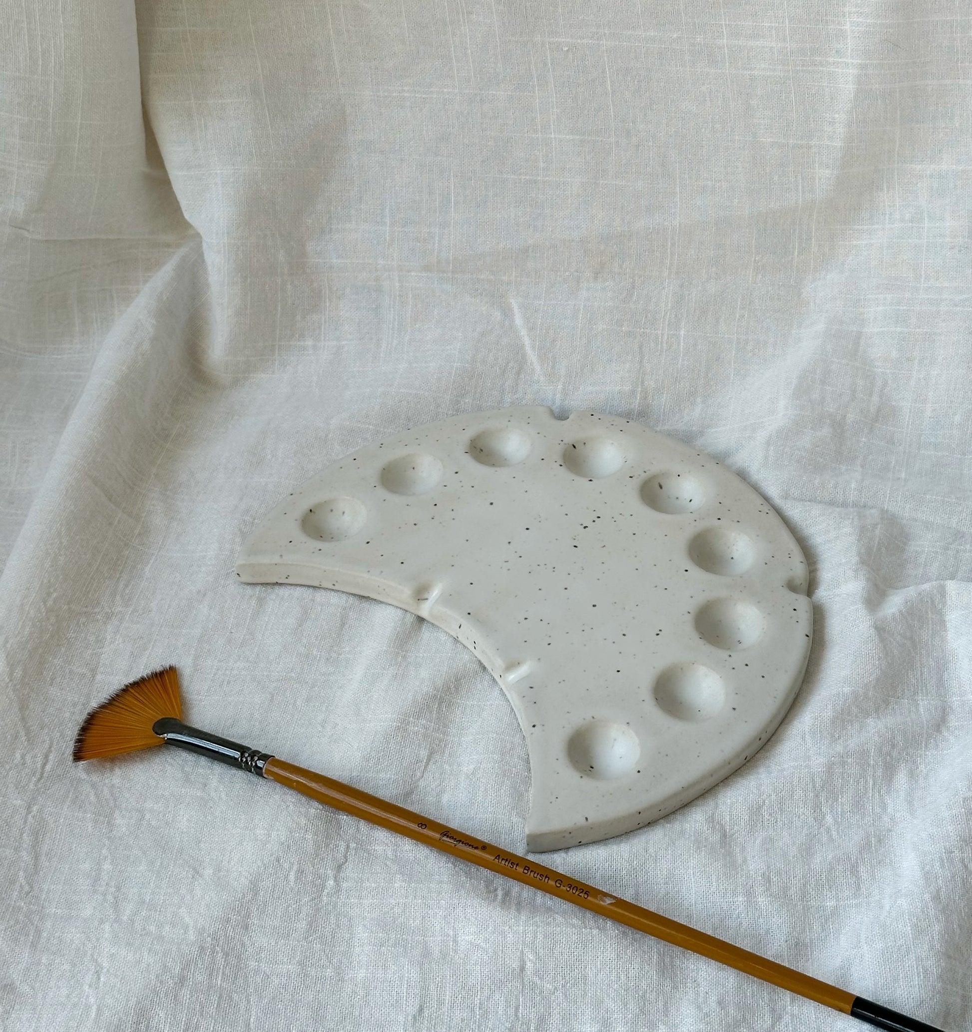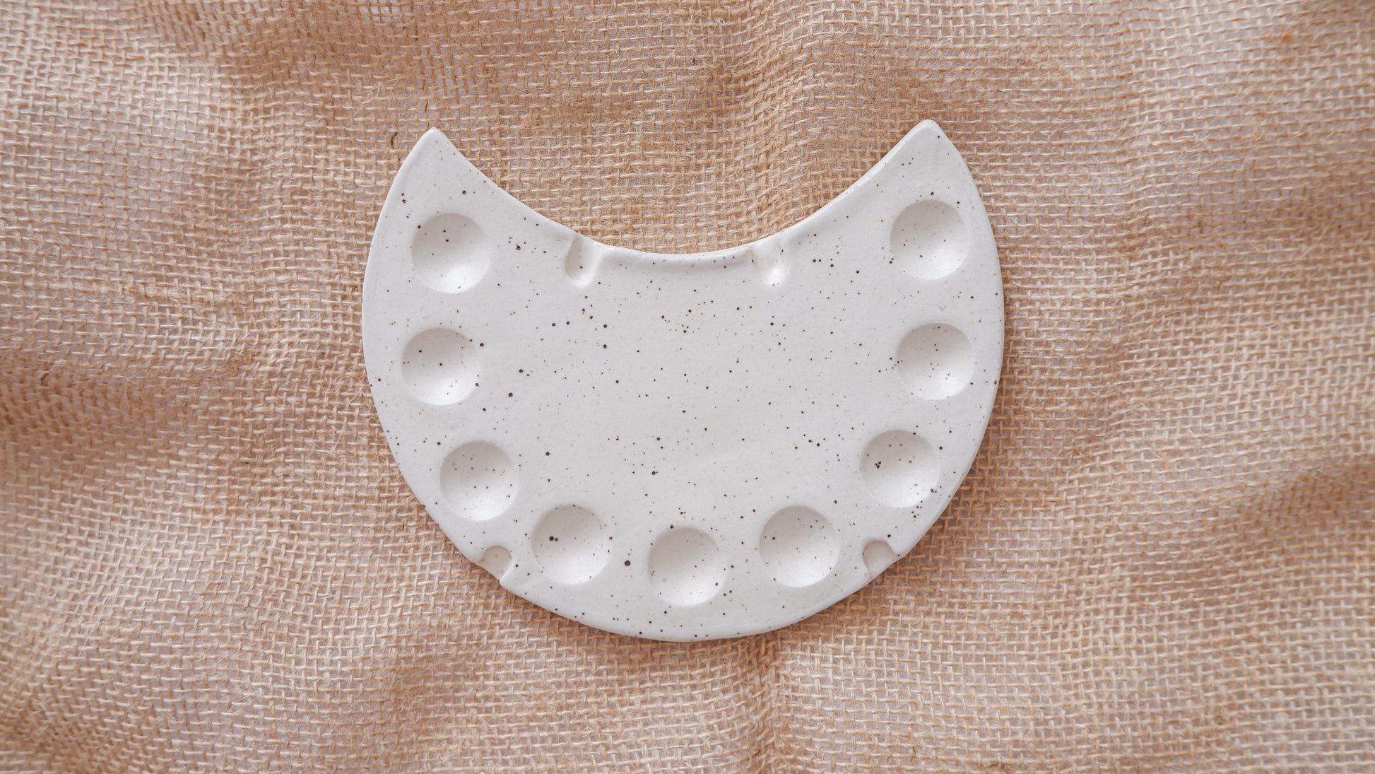 The stoneware ceramic speckled crescent moon paint palette is a beautiful and functional piece of art that is perfect for artists who enjoy using traditional methods to create their work. Made from high-quality stoneware clay, this palette has a unique speckled design that adds character and charm to any artist's workspace.